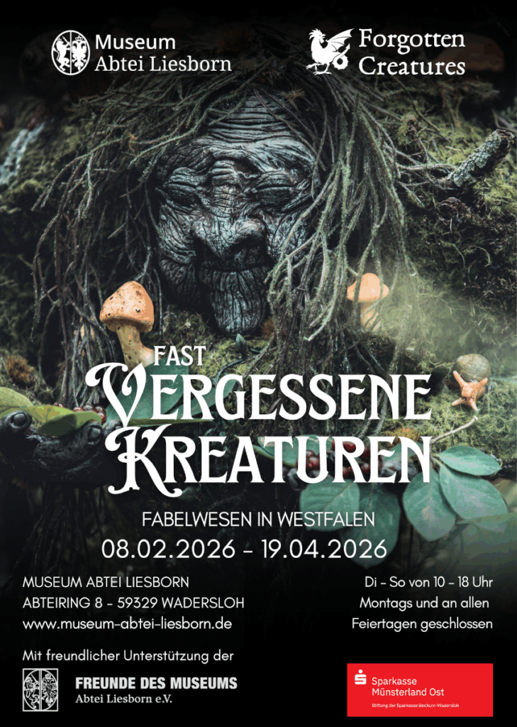 Vom 08. Februar 2026 bis zum 19. April 2026 ist die Ausstellung Dienstags bis Sonntags von 10 bis 18 Uhr im Museum der Abtei Liesborn zu sehen Obergeschoss) zu sehen. Unter dem Motto „Fabeltiere und Sagengestalten (nicht nur) aus Westfalen“ ist die Ausstellung um eine für Westfalen spezifische Stationen ergänzt.